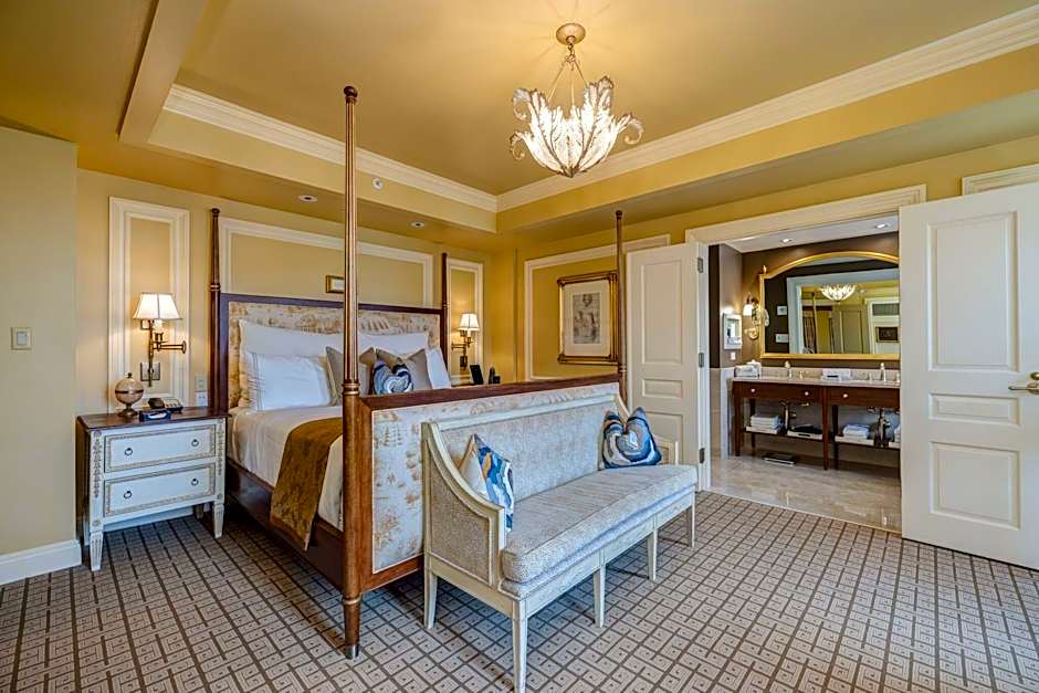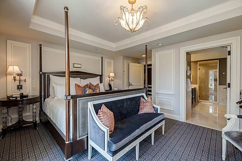 The bedroom is furnished with a king bed, while a separate parlor area has a pull-out sofa and a small dining table. Found in the parlor of each suite is a large writing desk as well.